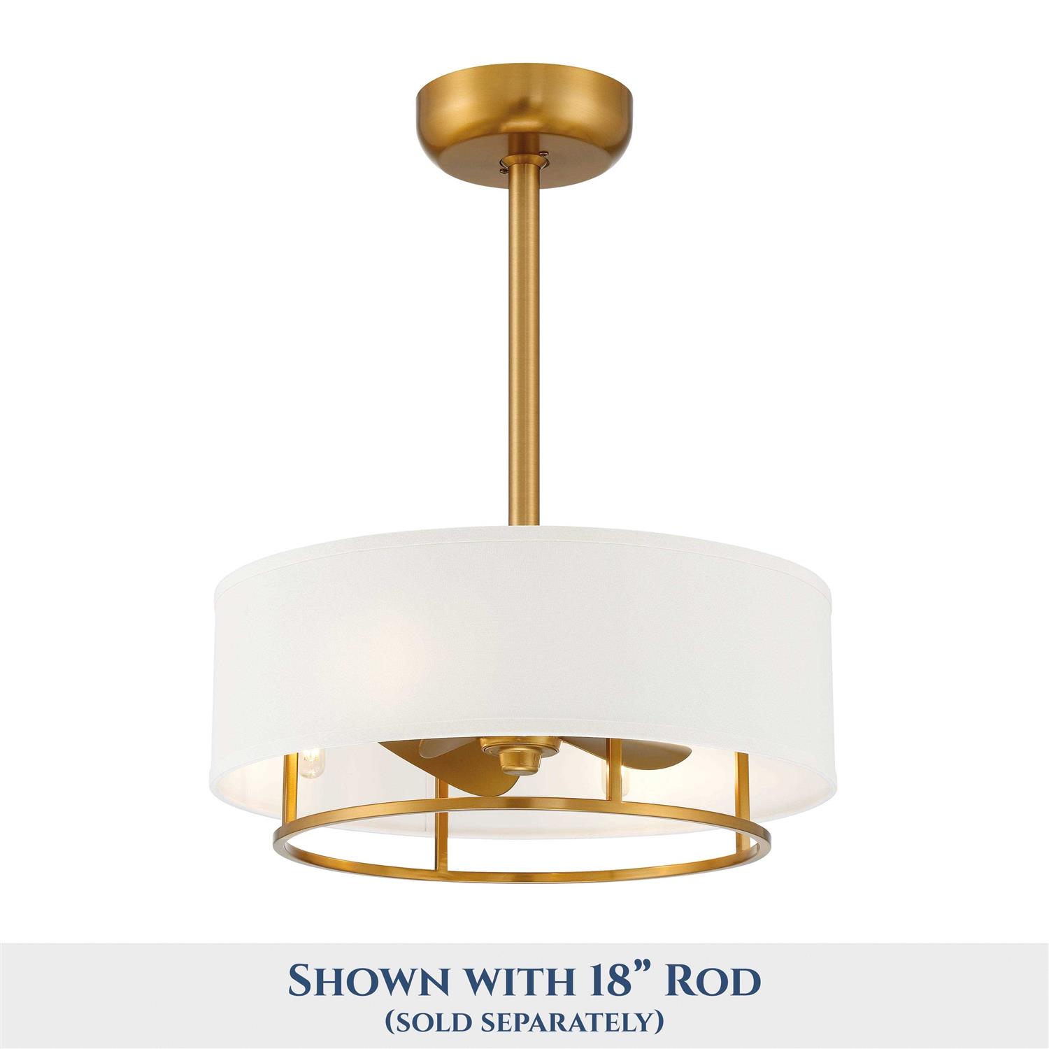 The Kaiti Ceiling Fan in Aged Brass finish adds a touch of modern, and a cooling breeze to any room. The clean lines of the white linen drum shade, is warmed by the plated brass steel frame. This fan with lights is very versatile, and is idea for use in medium to small sized rooms, like bedrooms, bathrooms, kitchens, laundry rooms, dens, and offices. This fan and lights is compatible for use on sloped ceilings, up to 30 degrees of slope, hardware is included.