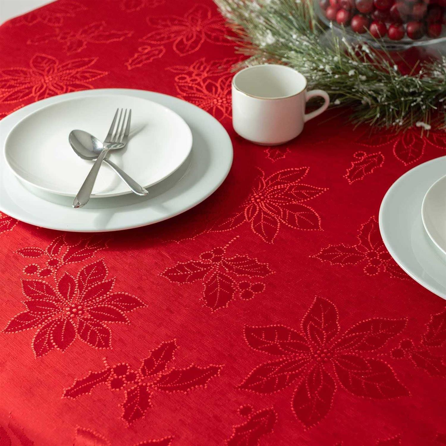 Fabric Content: 80% Polyester, 20% Cotton Woven Damask Easy Care Jacquard Damask Fabric Tablecloth Care Instructions: Machine wash cold. Gentle cycle. Wash dark colors separately. Use non-chlorine bleach only. Tumble dry low. Remove promptly. Lightly iron if necessary. Fabric Napkins sold separately. Effortlessly dress up your holiday décor with this festive tablecloth. Benson Mills brings you a tablecloth that is perfect for your holiday, winter, and Christmas décor. Effortlessly dress up your Christmas and holiday dinner with this luxurious jacquard damask fabric tablecloth. Whether with a casual gathering of friends or a formal holiday dinner, this versatile tablecloth creates a look of holiday elegance.