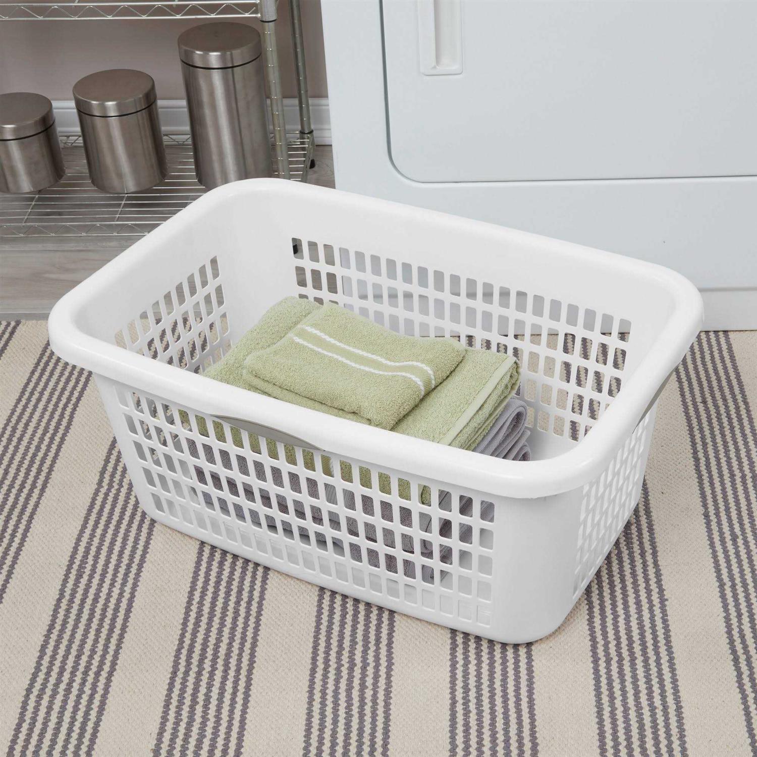 Make laundry day a breeze with the 2 Bushel Laundry Basket. This basket is designed with a wide, rectangular opening that allows for quick and comfortable loading and unloading of sorted or folded laundry. It offers a modern, contemporary look and feel with a polished finish that is easy to clean. The reinforced rim and durable design ensures fully loaded baskets will not bend or break, while the stylish rectangular hole pattern enhances airflow. Four durable handles integrated into the rim allow for comfortable carrying from all sides, making it easy to transport large loads to and from the laundry room. Its generous 2 bushel capacity is perfect for large families and is ideal for collecting dirty laundry and sorting a full household of clothing, towels or sheets. The overall assembled dimensions of this item are 27 1/8″ L x 18 1/2″ W x 11 7/8″ H.