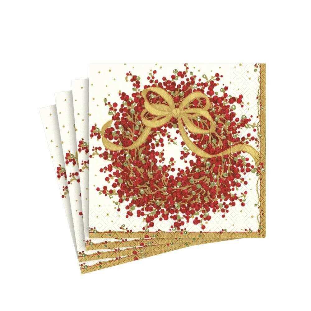 Caspari triple-ply napkins are both striking in design and durable in function. Thoughtfully designed to elevate any occasion, they feature artwork and designs from museums and artists around the world. Each is made of chlorine-free bleached triple-ply tissue and printed in Germany with non-toxic, water-based, food-safe ink. They are FSC-certified and made using environmentally-conscious raw materials, which ensures they are both biodegradable and compostable. Our napkins bring eco-friendly style and convenience to your tabletop. 20 napkins per package. Triple-ply material offers convenience and durability. Printed in Germany using non-toxic, water-based inks. 20 Cocktail Napkins per Package 12.7 x 12.7 cm when closed, 25 x 25 cm when open In this Design: A pretty red pepperberry wreath is tied with a flowing golden bow.