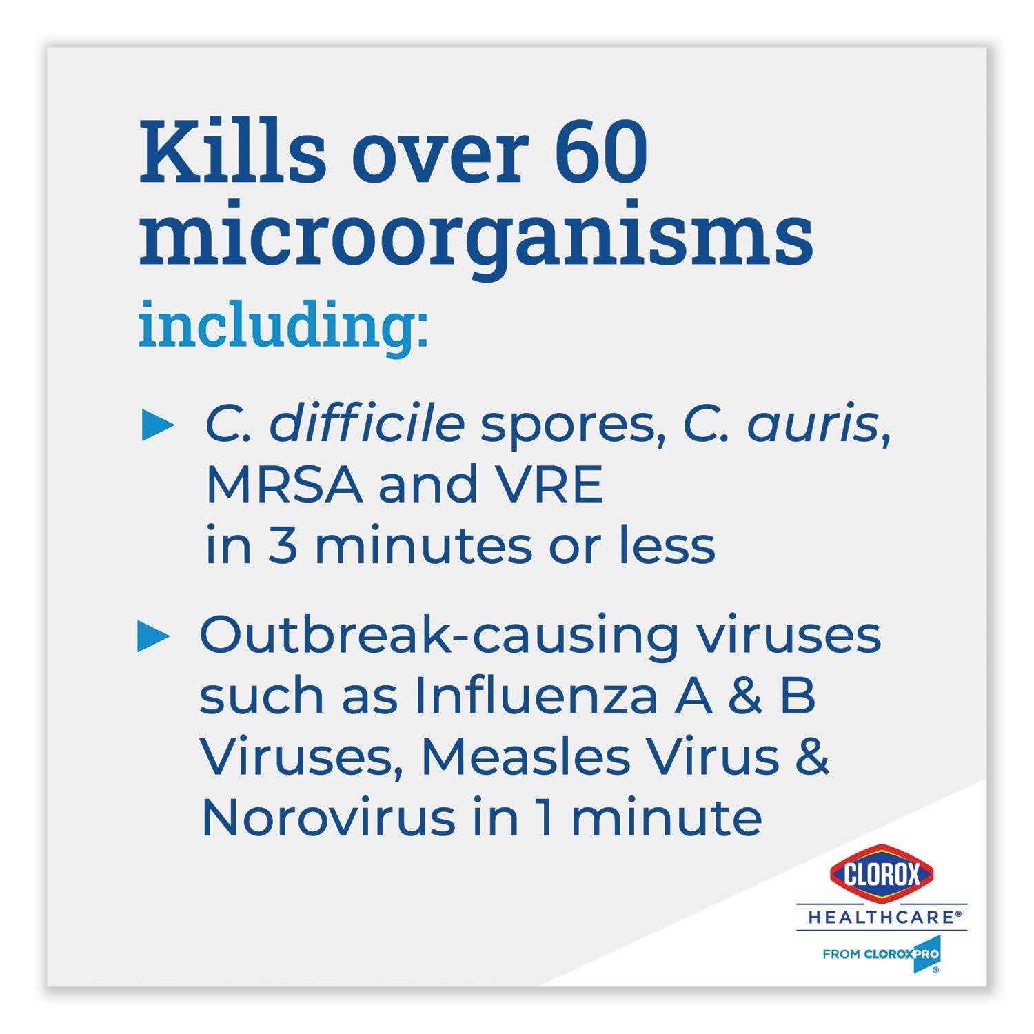 The Clorox Healthcare bleach wipes are your proven bleach solution for cleaning. This simple, convenient disinfectant will eliminate 50 or more microorganisms including C. difficile — all in 3 minutes or less while leaving a gentle odour-masking scent. The improved formulation maintains fast disinfection efficacy while improving surface compatibility and residue profile to meet the needs of a changing healthcare environment. Built to kill nearly 60 microorganisms in 3 minutes or less, our cleaners are ready to use and proven to be effective in the battle for a germ-free facility. Ideal for medical facilities, dental, veteriary, laboratory and general use.