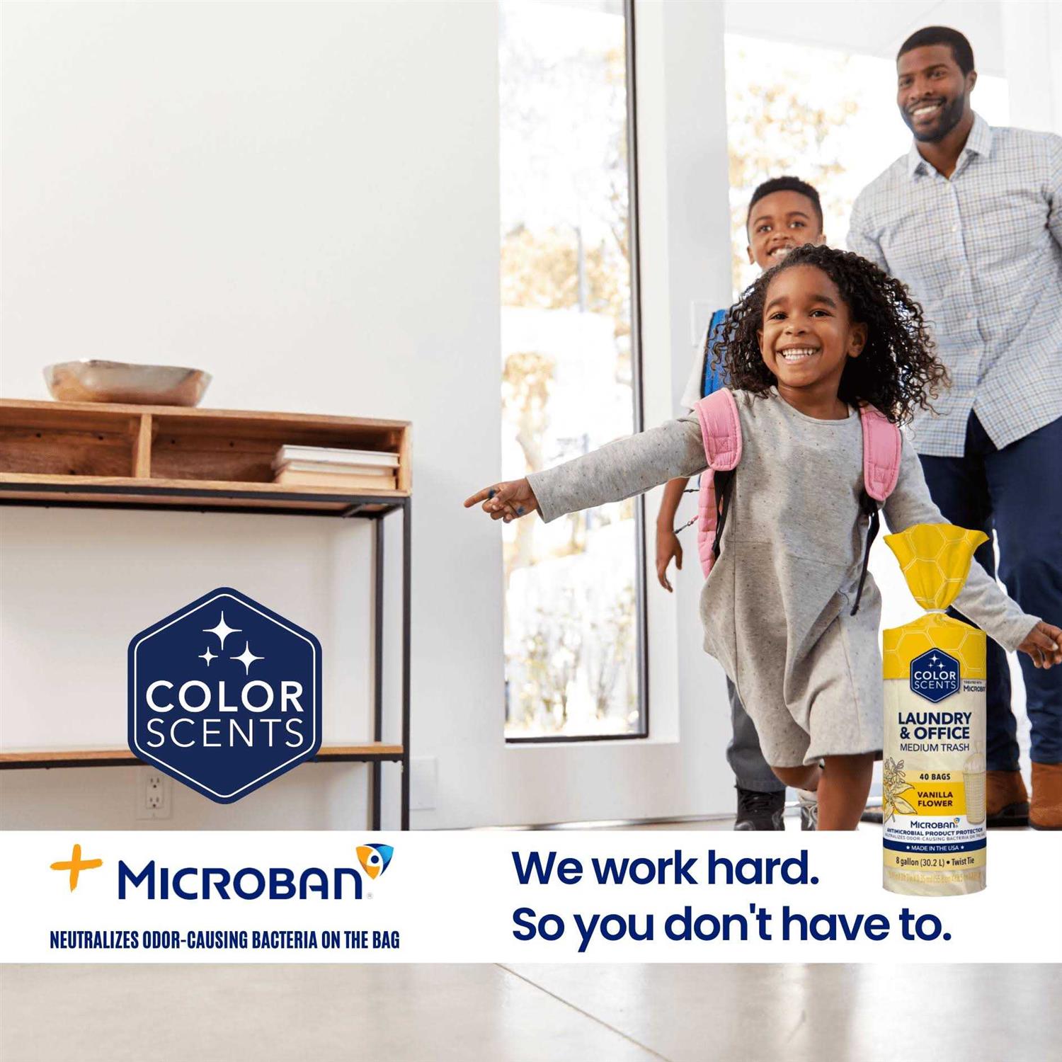 Color Scents 8-Gallon Medium Twist Tie Trash Bags are perfectly sized to handle life’s daily messes. For use in the laundry room, office or any room around the house where a medium bin is used. Our Vanilla Flower scent is delicate and delivers subtle bursts of fragrance to help maintain an inviting smell while combating unwanted odors. As a bonus, Color Scents is now enhanced with Microban for an added layer of protection against the growth of bacteria on the bag. Add in a pop of color with our home dcor complementing colors and voila, your house is a home!