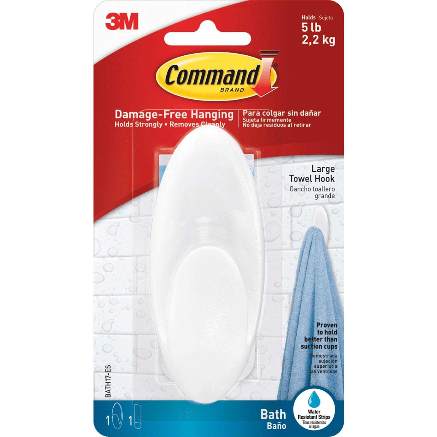 Command Large Towel Hook allows you to keep towels or robes off the floor, and hung up neatly so that they can dry in between uses. The hook sticks to many surfaces, including glass, mirror, tile, fiberglass, wood and painted surfaces. It is easy to apply and comes off leaving no holes, marks, sticky residue or stains. Repositioning is easy with assorted water resistant refill strips. Great for bathroom organization including guest and kids’ bathrooms, renters and dorm life!