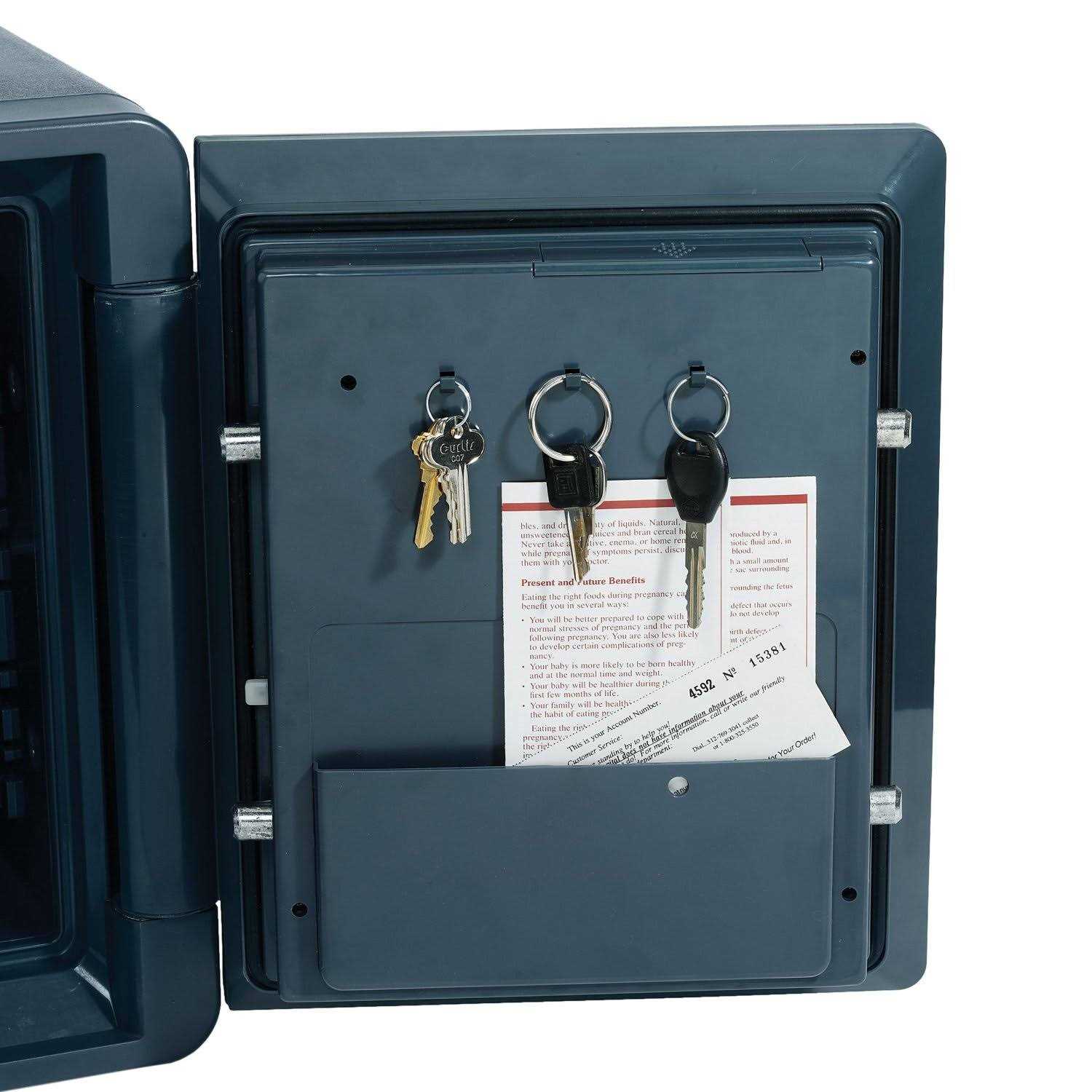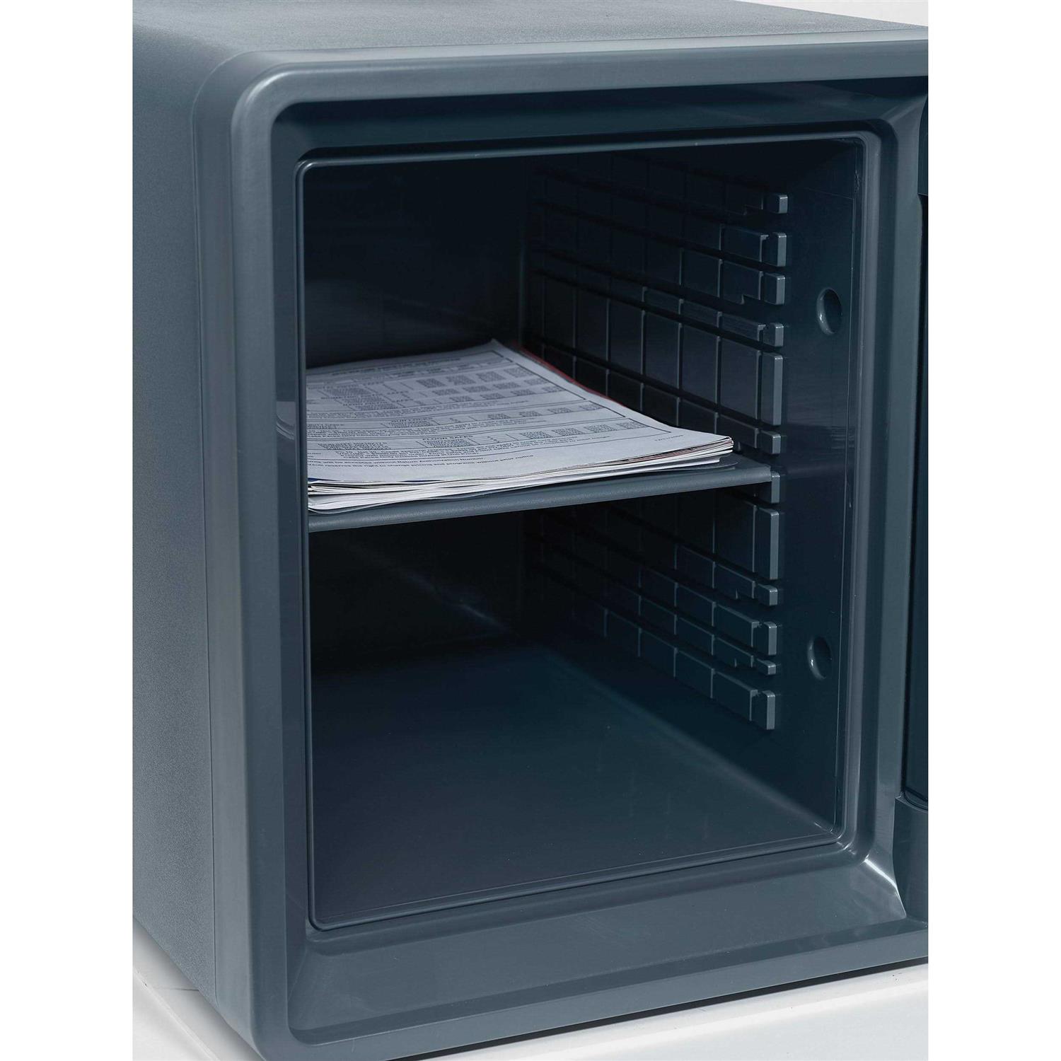 Safeguard your valuables against theft, water, and fire with the First Alert 2087F Waterproof and Fire-Resistant Combination Safe. Featuring a capacity of 0.94 cubic feet, this waterproof safe comes equipped with a four-number combination dial security lock and offers enough space to store money, documents, jewelry, and other precious belongings. The safe has also been verified by an independent testing lab to protect electronic media, including memory sticks, CDs, DVDs, and external hard drives. This fire-resistant safe can withstand external temperatures of up to 1700 degrees Fahrenheit for up to one hour while maintaining an internal temperature of less than 350 degrees Fahrenheit. Equipped with pry-resistant concealed hinges and a waterproof seal, the safe resists forcible break-in attempts and keeps contents dry even if fully submerged. It is also designed to float, so it is easy to find during a flood. Four live-locking door bolts provide additional security by keeping the door firmly secured, while an emergency override key ensures you do not lose access to your items–even if you forget the combination. And thanks to its adjustable storage shelf, key rack, and door pocket, this safe makes it easy to organize your valuables. Size: .94 CuFt. Color: Gray.