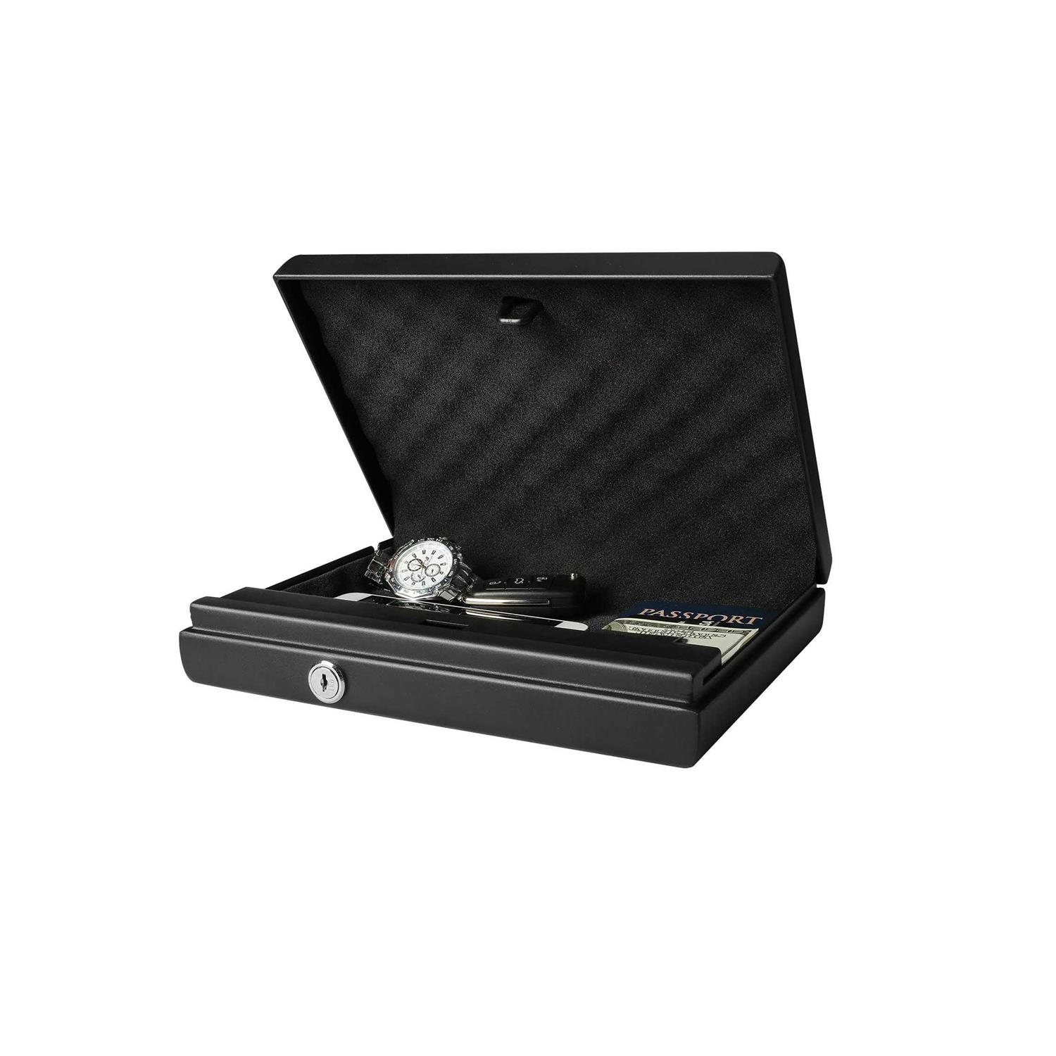 This Fortress compact, portable safe model 11E20 will provide peace of mind and is designed to protect and secure your handgun, wallet, phone and other valuables at home and on the go. The compact design provides for portability and fits under your car seat or in your luggage. This model has a backlit electronic lock that allows for a 38-digit personal code, Mute U function you can silence the keypad for quiet entry and includes a set of back up keys. This safe is made of solid steel construction and includes a 1500 lb. test steel cable to secure to fixed objects. It has a foam padded interior and meets TSA travel guidelines. Fortress portable safes offer an application for everyone. Feel safe with Fortress 11E20 and secure yours today!
