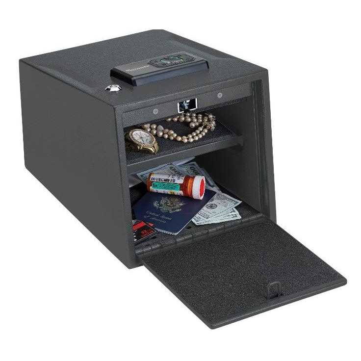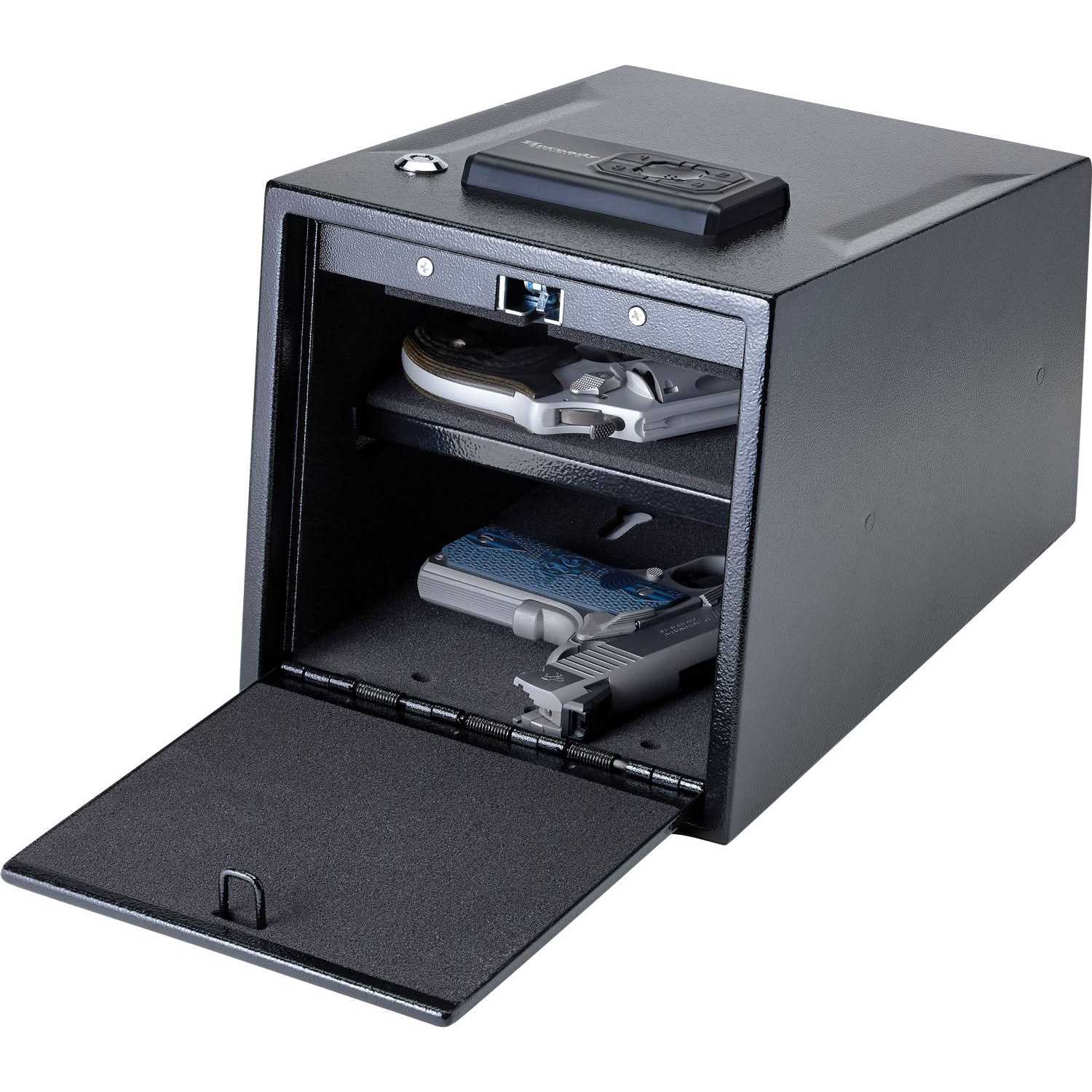 The roomy Hornady Keypad 2-Gun Handgun Safe securely stores up to 2 handguns, where only you or others chosen by you have access to the firearms. The spring-loaded door opens immediately by punching your personalized security code into a keypad, or with a back-up barrel key. (Keypad can be programed with a 4- to 6-digit code.) An interior light automatically illuminates when opening the safe, and a protective foam lining safeguards contents from damage. The removable interior shelf helps organize handguns and other personal valuables. The Keypad 2-Gun Handgun Safe is constructed of 16-gauge steel, and predrilled holes allows you to fasten the safe to a shelf, drawer, or wall. Four AAA batteries (not included) are required to operate the keypad and light, though the safe can still open without power by using the key lock. Selectable audible and visible low-battery indicators let you know when batteries need to be changed. Exterior: 12.7L x 8.8W x 9D. Type: Personal Safes.