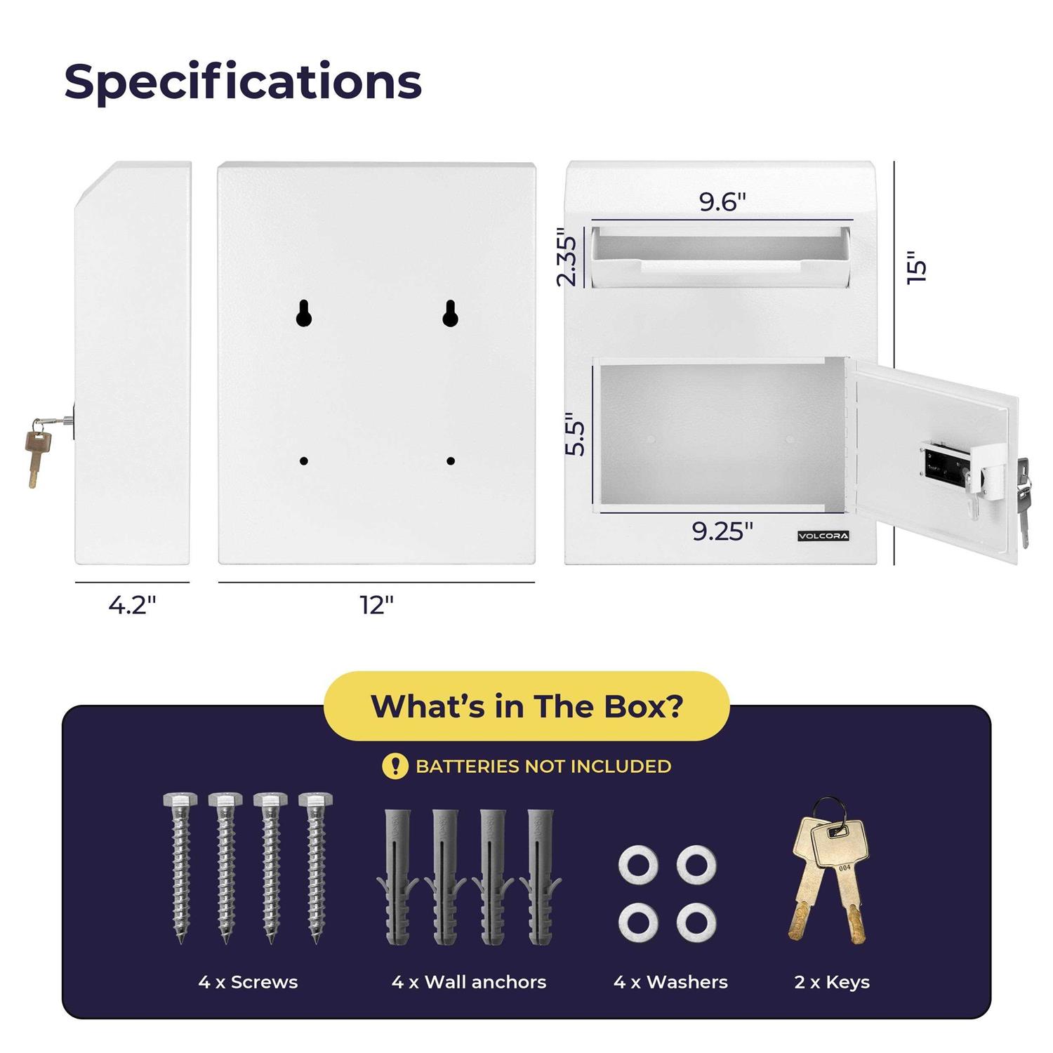 Volcora’s wall mounted lock box is perfect for business owners intended for primarily mailbox indoor use as a drop box safe for keys, cash, money, payment, check, documents and other important things. Our drop boxes with lock for business are designed with top notch security including both key and electronic lock capability for anti theft protection and maximum security. The cash drop box with lock can be conveniently wall mounted with pre drilled holes, mounting screws and simple instructions to mount in the most secure location for your business. Equipped with a safe one way access hinge door slot to fully protect from thieves and provide maximum security for the durable high quality cash box with lock and slot.