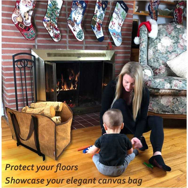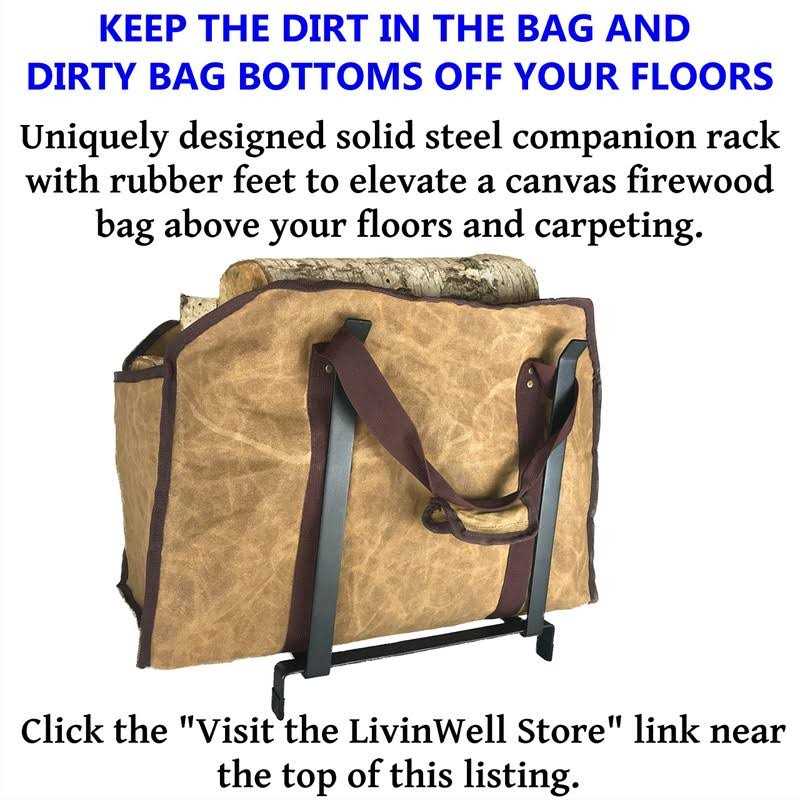FIVE REASONS to choose THIS firewood carrying bag for a great looking durable wood tote that will not mess up your home: (1) STANDS BY ITSELF for easy loading. Stiff waxed canvas and reinforced corner seams let the bag stand up with no hidden plastic rods that poke through the canvas in time. (2) STRONG CARRY STRAPS can never tear loose because they wrap all the way around the bottom of the bag. No plastic, vinyl or leather straps that will age and break. (3) CLOSED BASKET ENDS to keep floors clean. Open end totes should only be used as an outdoor firepit accessory. Also, comfortable carry handle grip with Velcro keeps your bundle together. (4) LARGE CAPACITY to handle big bundles of fire logs. 23.5″ x 11.5″ basket is 12″ high at the ends and 17″ tall on the long sides.. Folds small for storage. . Also great for groceries shopping tools gardening or any bulky heavy loads. (5) GREAT LOOKS THAT IMPROVE WITH AGE Tough stiff heavy duty 16 oz. waxed canvas is stitched into a large rugged and strong large carry bag. Scrapes and wrinkles build up the classic aged “patina” look with use. ** BUNDLE AND SAVE $6.00 !! ** when you add our metal ELEVATED LANDING RACK that is uniquely shaped to support an indoor log bundle WHILE STILL IN THE BAG WITH THE DIRT. Click the “Make it a Bundle” button below or, if using a mobile device, click the “Visit the LivinWell Store” link near the top of this listing to find the bag and rack bundled savings.