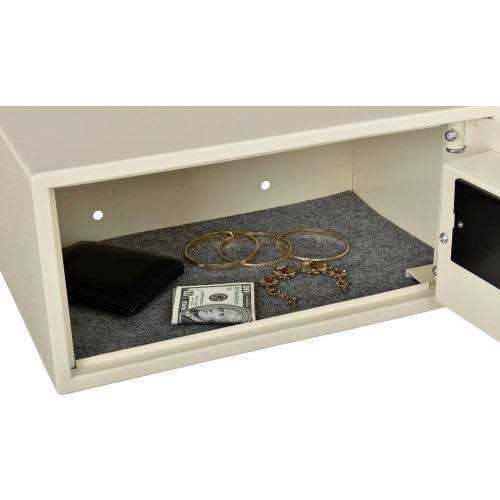 The safe is made of steel for long lasting durability. The hotel, dorm and patient safes are specially designed for personal in room use. Pry resistant recessed door for anti-theft protection. Concealed hinges prevents door removal and ensures a lifetime of smooth operation. Interior space with removable carpet to protect your valuable belongings. Features advanced battery-operated electronic card-swipe lock. Accepts almost any card with a magnetic strip. Operate the safe using the keypad or the card-swipe. Large LED display shows the status of the safe. Battery operated electronic lock.4AA batteries required, not included. Mechanical override keys 2 keys included used to bypass the electronic lock if the batteries expire. The keypad will go into a lockout penalty if combinations are entered incorrectly. Anchor holes allow wall and floor mounting for unit stability Hardware included.