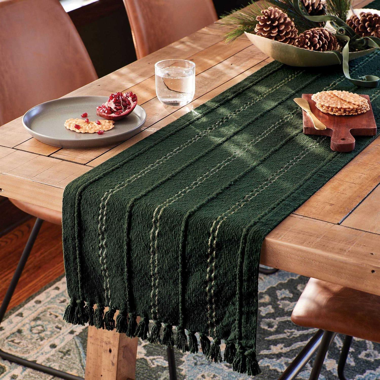 Enhance your dining room’s aesthetic appeal with this Cotton Textured Single-Layer Table Runner from Threshold . This rectangular table runner features textured stripes in gold on a green background for classic appeal, while a tasseled hem lends extra flair. Made from a soft fabric blend, you can simply toss it in the washing machine for a quick refresh whenever needed. Threshold : Looks like home, feels like you.