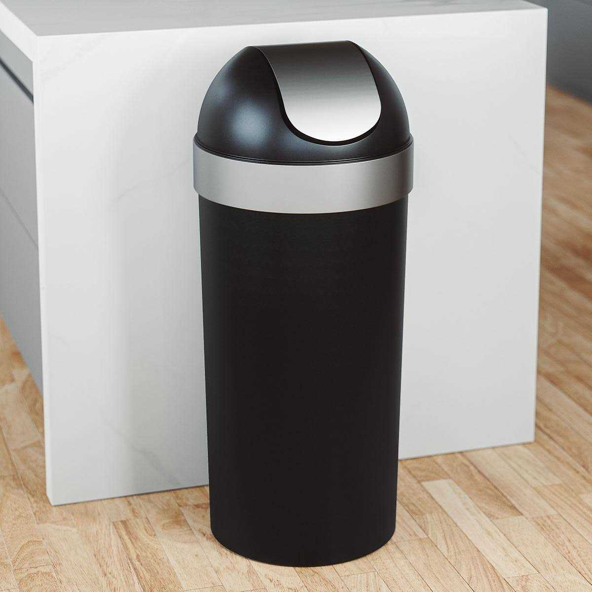 Simple, sophisticated design and durable construction make our Venti Can by Umbra a fabulous choice for any home or office. The generous capacity is large enough to accommodate even the busiest kitchens! 16.5 gallon capacity Made from polypropylene with metallic accents Features a swing-lid top and a bag ring to secure and conceal a plastic trash bag Dimensions: 14-3/4″ diam. x 35-1/2″ h