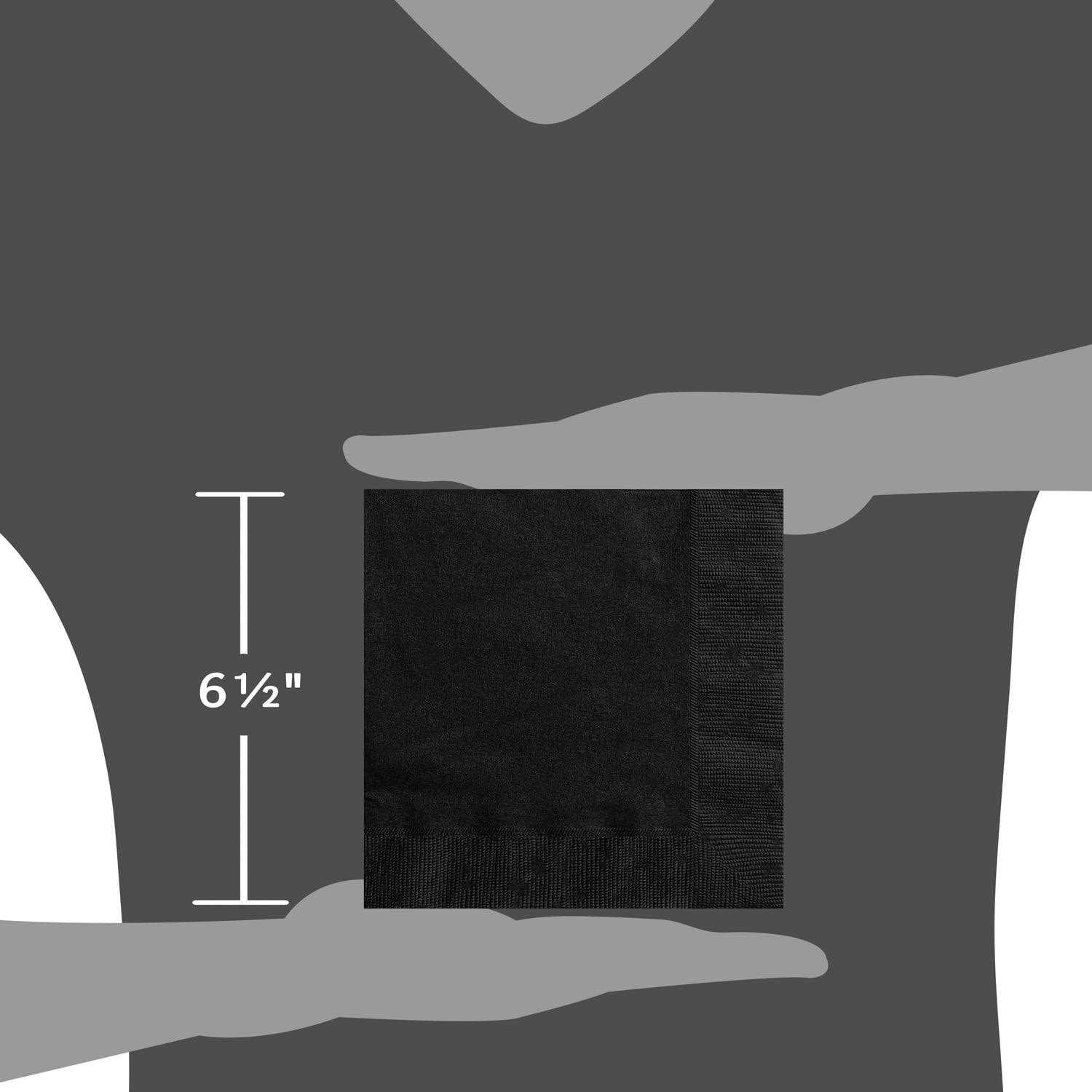These Solid Black Luncheon Napkins, 24 Count are a classic complement to any party or special occasion. This set of napkins will help tame party stains and spills, adding an elegant touch to any tablescape. They are two-ply, for extra absorbency. The napkins are disposable, so party cleanup is fast and simple. Coordinating with matching party supplies for an all-encompassing look. The simple black color lends itself easily to any solid or pattern, for effortless pairing with any party decor. Their larger size makes them ideal to set directly on tables for more intimate gatherings or on buffet tables for larger events. This pack includes 24 paper napkins. Each napkin measures 6.5 inch x 6.5 inch.